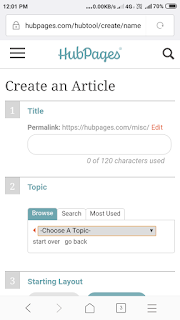 Article का title डाले,choose topic पर click करें।besic click करें।अब new पेज पर आप आप article लिख सकते हैं।photo भी डाल सकते हो।hubpages आपको बहुत सारे टूल provid करता हैं।